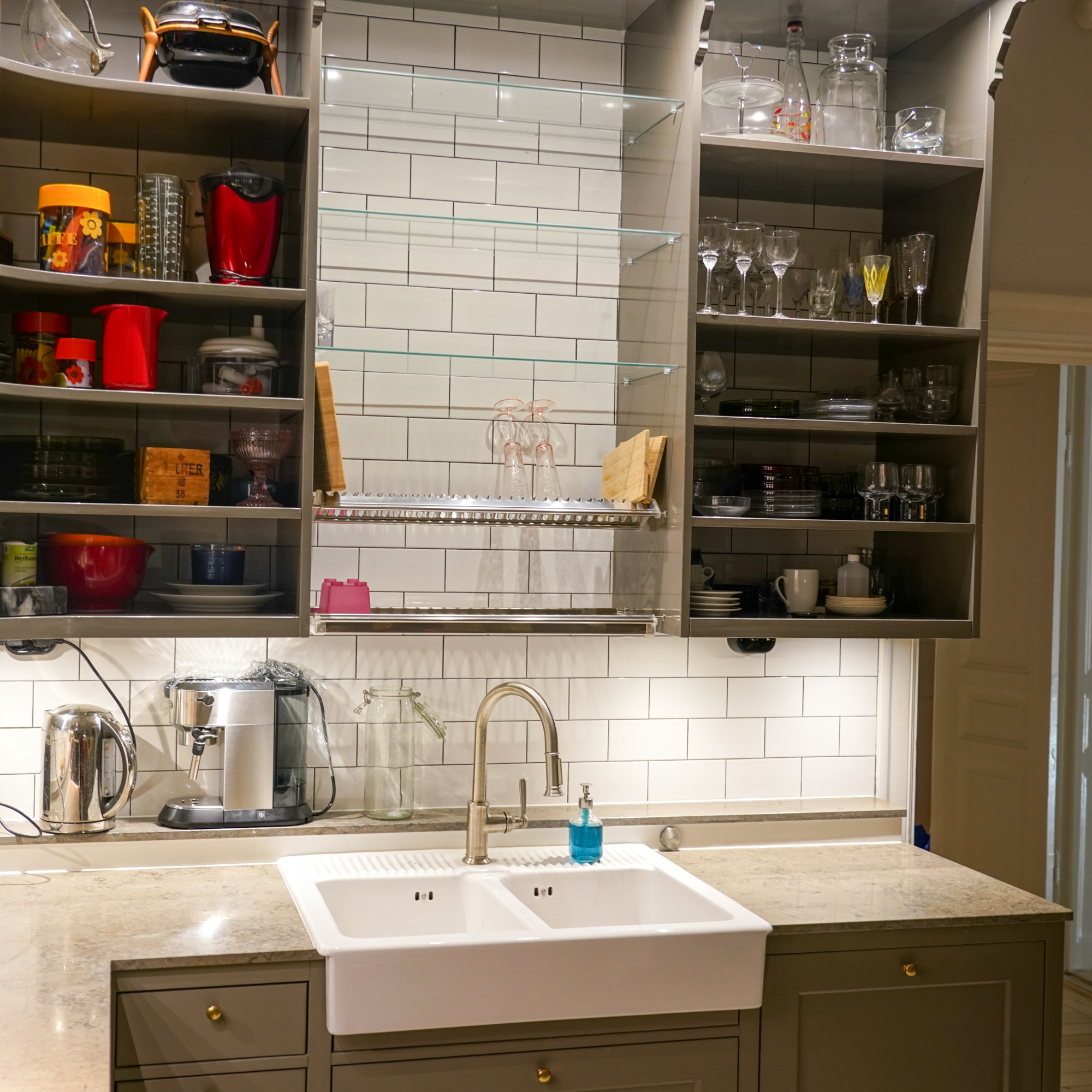 Ett kök med mycket karaktär i ett hem där materialen får tala. Infällda luckor, vitpigmenterad furu och detaljer i rostfritt skapar en känsla som är både stram och inbjudande. Här står köket i harmoni med arkitekturen utan att ta för stor plats.