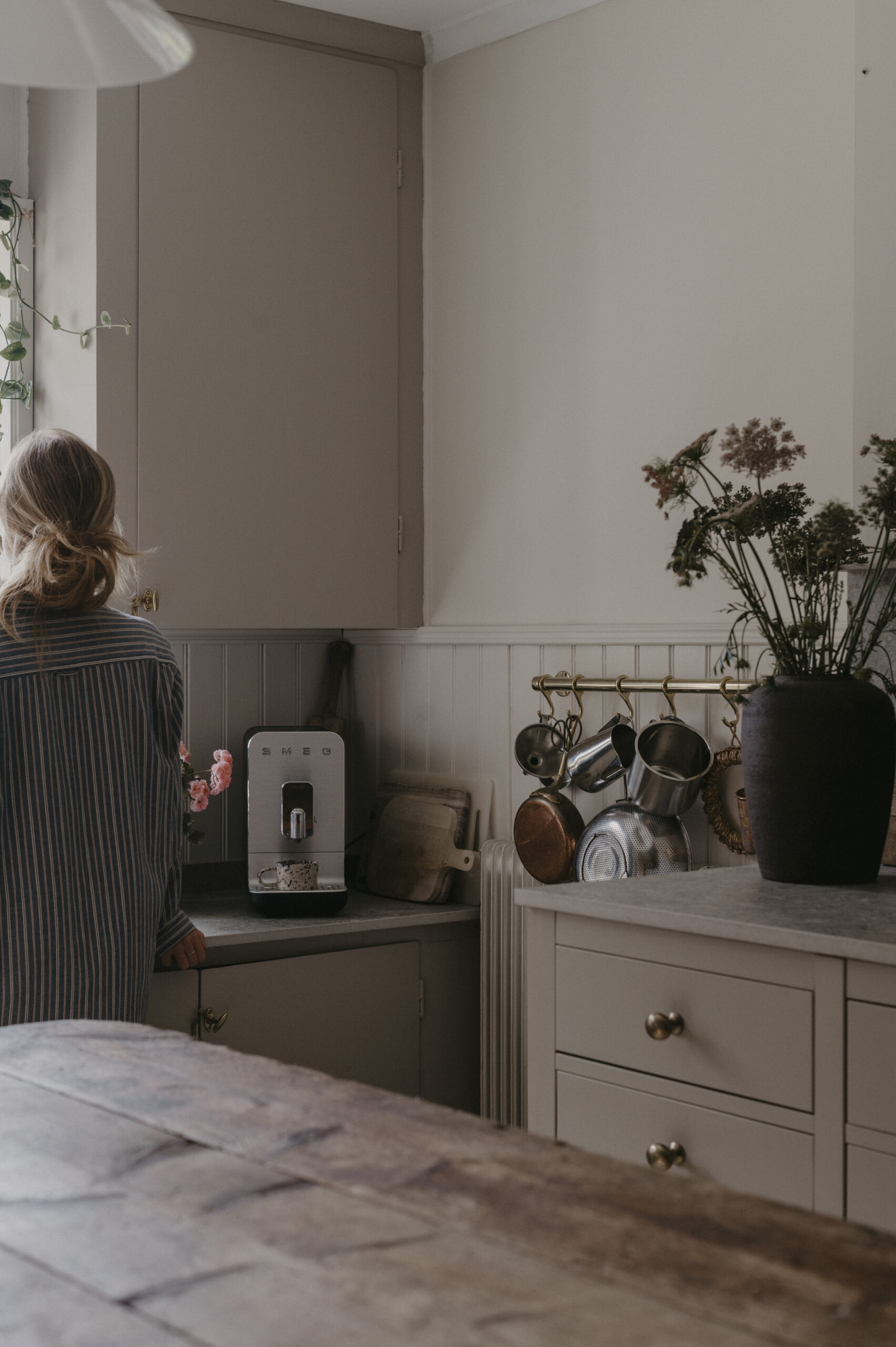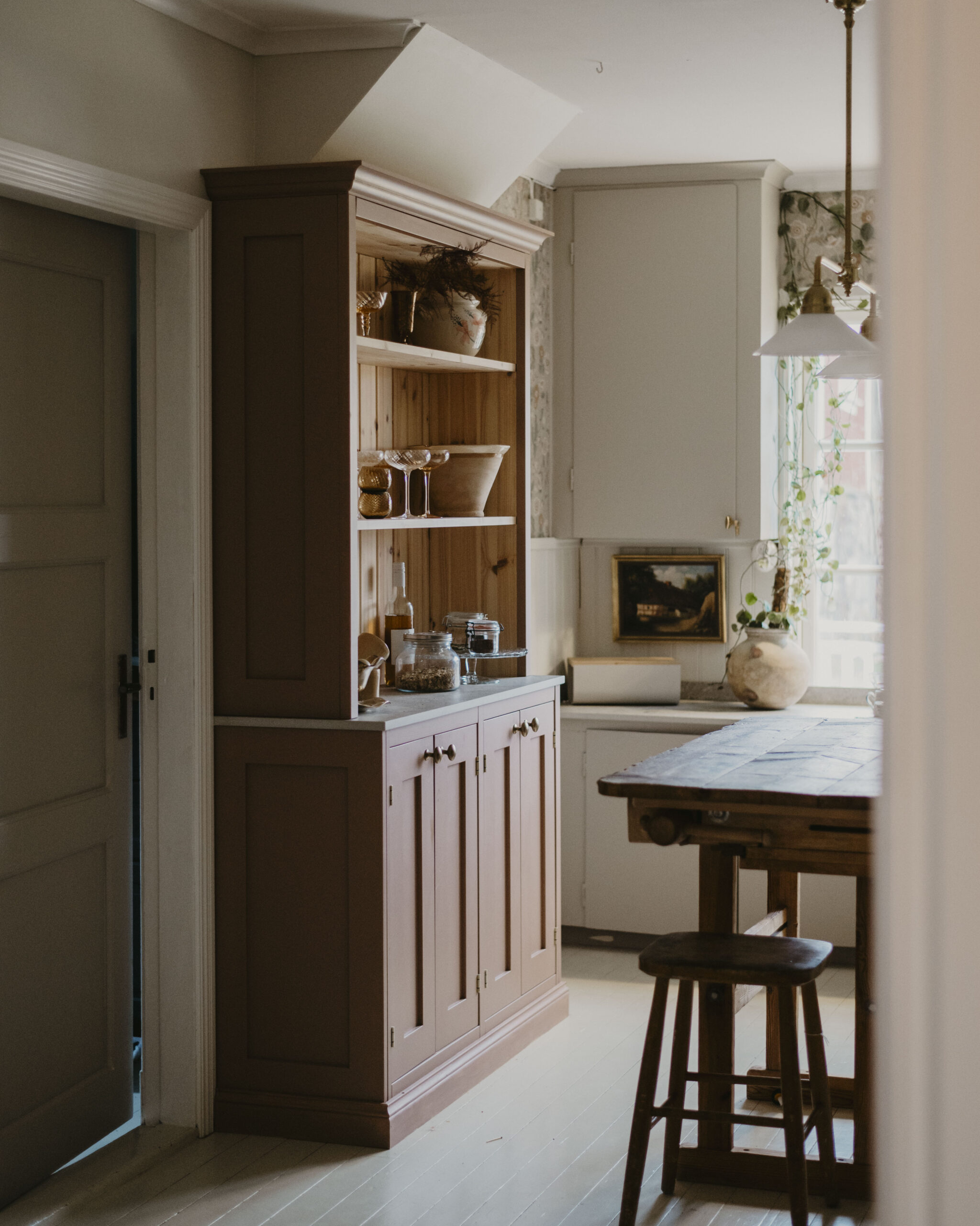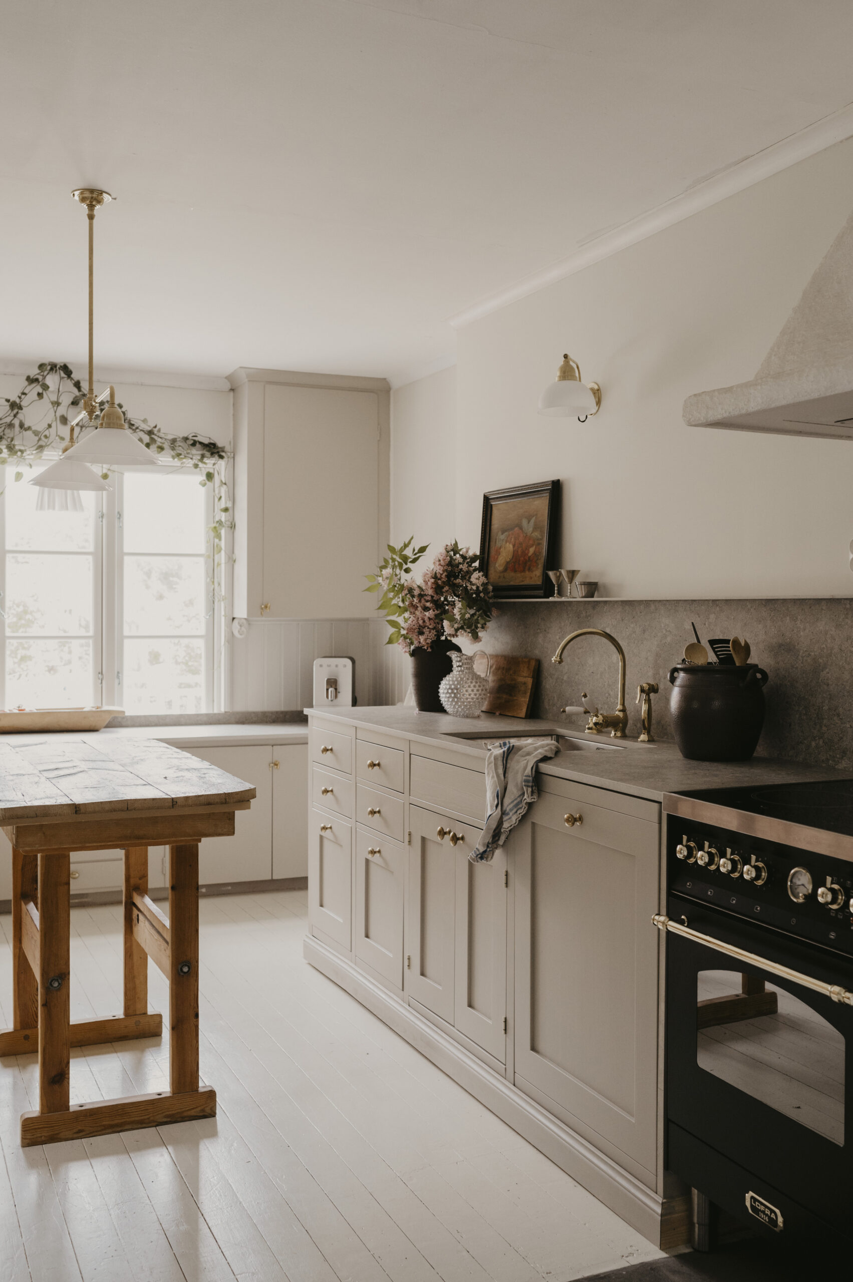 Lovisas soliga idyll är ett kök som utstrålar värme och hemtrevnad, där varje detalj bidrar till en lugn och inbjudande känsla. Med köksluckor målade i två olika kulörer skapas en subtil kontrast som både lyfter och binder samman rummet. Den varma och naturliga färgpaletten förstärker känslan av ett tidlöst hem, där funktion och estetik möts.