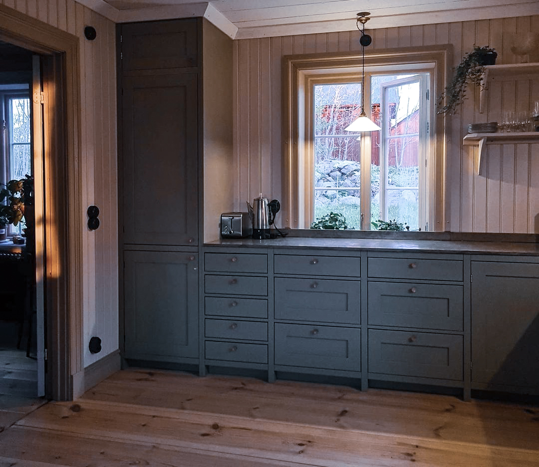 Detta kök utstrålar en kombination av skandinavisk enkelhet och tidlös design, där vackra detaljer och noggrant utvalda material skapar en inbjudande och rogivande atmosfär. Den dämpade röda tonen på de nedre skåpen står i perfekt kontrast till de ljusare överdelarna, vilket ger ett djup och ett modernt uttryck i rummet. Kyl och frys är diskret integrerade i högskåp, vilket framhäver den rena och funktionella designen.