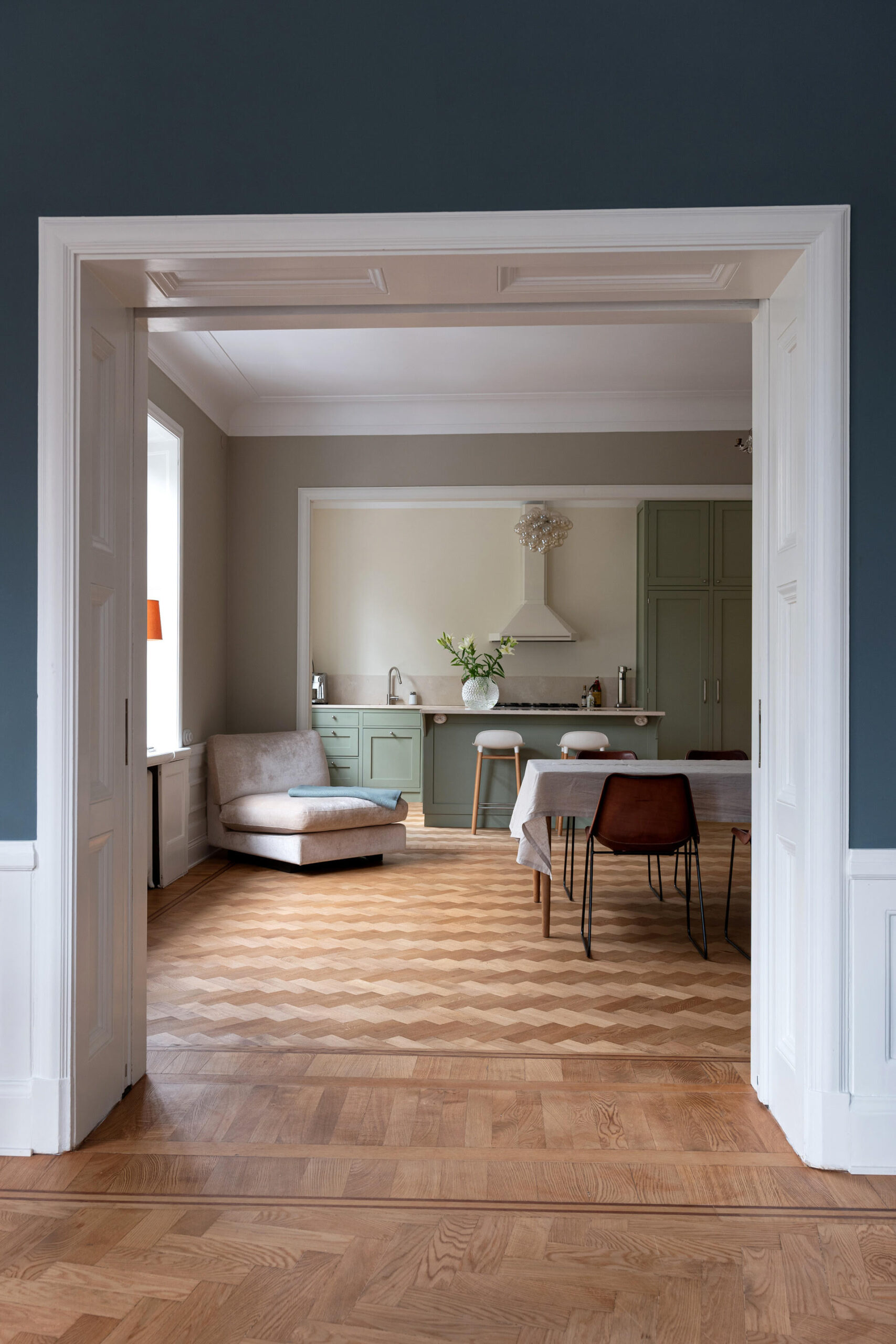 De mjuka gröna tonerna lyfter rummets karaktär och samspelar med ljuset som flödar in från flera håll. Den klassiska köksön ramar in rummet och blir en naturlig plats för både matlagning och samtal.